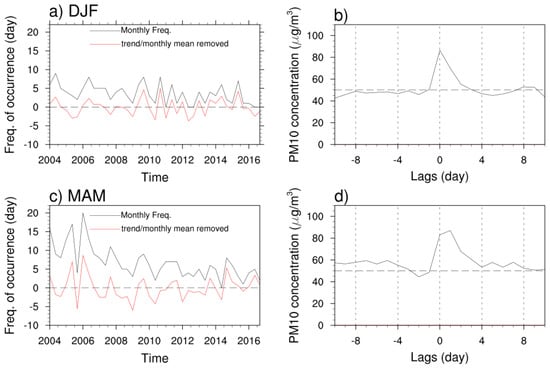 Timeseries of the monthly frequency of occurrence of high PM10 events over South Korea are shown for (a) DJF and (c) MAM. The black line is the monthly frequency, the red line is also the monthly frequency but with removed monthly mean and removed linear trend. (b,d) are lagged composites of daily PM10 concentration for the high PM10 event onset at DJF and MAM.
