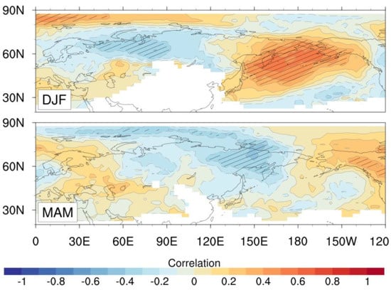 In winter, positive and significant correlations between the North Pacific blocking and the nationwide fine dust pollution in South Korea are found (Figure 3, top panel). There are positive correlations values of 0.3 to 0.6 in the North Pacific, including the Korean Peninsula. In addition, there are negative correlations of −0.2 to −0.4 in northern Eurasia (50–80° N, 30–120° E). Blocking in the eastern part of the Ural region (60–90° E), which is known to affect cold waves in Korea, shows high negative values. Correlations between the Ural region, the central Pacific, and the Korean Peninsula exceed the 95% confidence level, showing high reliability. These results suggest that in winter, there were frequent high PM10 events in the months when there were frequent blockings in the Pacific Ocean, while in the months when there were frequent blockings in Ural, there were fewer high PM10 events in Korea.