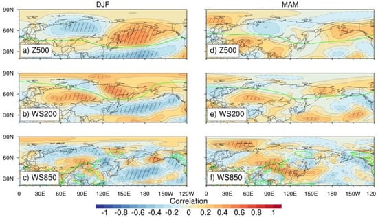 The correlations between the monthly frequency of high PM10 events over South Korea and (a,d) the 500 hPa geopotential height, (b,e) the 200 hPa wind speed, and (c,f) the 850 hPa wind speed for (a–c) DJF and (d–f) MAM. The contour interval is 0.1. Solid contours are positive, dashed contours negative. Green contours mark the climatology for each season: (a,d) 5500 m for the 500 hPa geopotential height, (b,e) 15 m s−1 for the 200 hPa wind speed, and (c,f) 5 m s−1 for the 850 hPa wind speed are shown. The hatched areas show where values exceed the 95% confidence level.