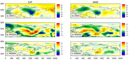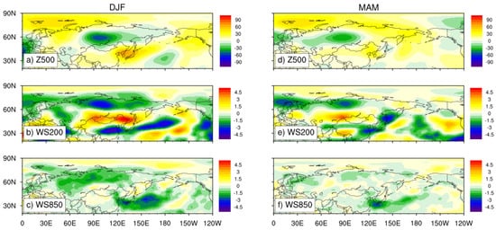 The composite map of (a,d) 500 hPa geopotential height, (b,e) 200 hPa wind speed, (c,f) 850 hPa wind speed daily anomaly for (a–c) DJF and (d–f) MAM when the high PM10 event takes place with a positive anomaly of the daily 850 hPa wind speed at Korea.