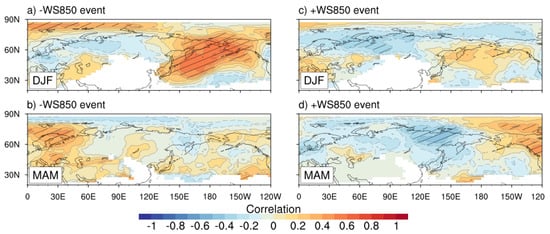 Figure 7 illustrates the correlation between the monthly frequency of +WS850 and –WS850 events and the monthly frequency of blocking. Compared to Figure 4, the −WS850 events show an increase in values along Far East Asia and the western North Pacific, especially in winter, with a correlation of more than 0.4 and a high confidence in the wide Pacific region. Ural blocking decreases its value by 0.1 (see Figure 7a) and loses its significance. Conversely, for the +WS850 events, shown in Figure 7c, the Ural region has the same value and significance as in Figure 3. In addition, Pacific blocking is associated with a positive correlation in a wide area, but with a reduction of 0.3 in correlation and with no significance. In spring, for the −WS850 events there is a correlation of 0.2 in the Far East Asia region, which is opposite to the correlation in Figure 3. However, the correlation and significance are still low. For the +WS850 events in spring, the pattern of correlation remains similar to that in Figure 3, and the values over the Kamchatka Peninsula have increased by about 0.1.