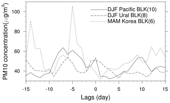 Moreover, the temporal development of blockings over the North Pacific, Ural-Siberia, and Korea was examined. In the case of the North Pacific and Korea blockings, before the onset, a low pressure system forms over Siberia, which can increase the amount of dust transport to Korea by strengthening the north-south pressure gradient. During the blockings of the three regions, the PM10 concentration over Korea was decreased along with the weakened pressure gradient between the deserts and Siberia. In contrast, the Ural-Siberian blocking did not show the circulation anomalies that could increase the dust transport to Korea before the onset of the blocking.