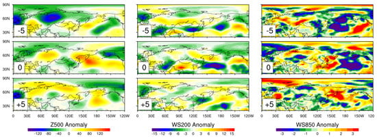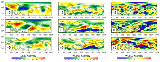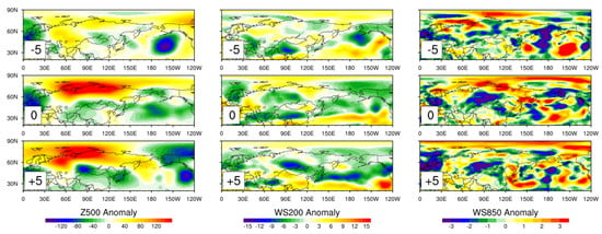 Lagged composites of (left) the 500 hPa geopotential height, (middle) 200 hPa wind speed, (right) 850 hPa wind speed anomaly for winter Pacific blocking at lag −5, 0, and +5 days.