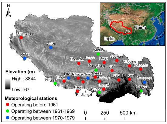 Spatial distribution of the meteorological stations over the mid-south of Tibetan Plateau considered in this study. The stations that are valid during 1961–2017, 1970–2017 and 1980–2017 are denoted by red, green and blue circles, respectively.