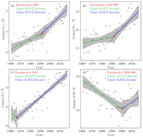 Given these disparate findings in the aforementioned studies, using a statistical method to re-examine the timing and magnitude of climate phase change on this plateau is particularly necessary [3]. Change-point analysis is a testable method for objectively detecting the significant shift of temperature trends, such as piecewise linear regression [2,3,31,32].