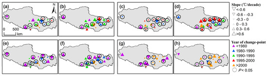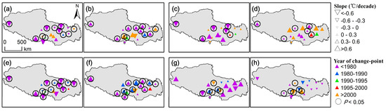 In the cold season, the change-points of Tmean and Tmin primarily occurred before 1980, but these trend shifts in most stations were insignificant (Figure 4a,b,e,f). The change-points in Tmax mainly occurred in the 1990s, especially in the early 1990s, and the increasing trend in Tmax at most stations was much higher after the change-points than before the change-points (Figure 4c,d). Moreover, the DTR at most stations displayed a narrowing trend before the change-points and an expanding trend afterwards (Figure 4g,h). In the warm season, the change-points in Tmean, Tmax, and Tmin at most stations occurred before 1980 (Figure 5a–f). At more than half of the stations, Tmean and Tmin showed decreasing trends before the change-points but showed rapid warming afterwards. The trends in DTR shifted from increasing to decreasing before 1985 at more than half of stations (Figure 5g,h).
