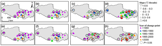 Accelerated warming trends in annual Tmean, Tmax, and Tmin appeared after the change-points at most stations on the mid-south of Tibetan Plateau compared to before the change-points (Figure 3a–f). The change-points of Tmean and Tmax primarily occurred in the 1990s, while those of Tmin occurred before 1990. Specifically, at about half of stations, the change-points in Tmean occurred in the early 1990s, while the change-points in Tmax occurred in the middle 1990s. Moreover, the trends in DTR at more than half of the stations shifted from decline to increase around 2000; the remaining stations displayed lower rates of change after the change-points than that before the change-points, which mainly occurred before 1970 (Figure 3g,h).