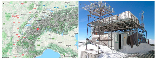 Geographical position of PRS (north-western Italian Alps, geographical coordinates: 45.93436° N, 7.70778° E, 3480 m a.s.l.) (a), picture of the PRS (b).
