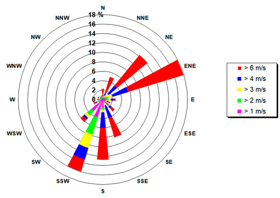 The wind speeds are generally greater than 4 m s−1, and thereby reduce any eventual impacts of local sources. An analysis of the intensity and direction of the winds gathered in the 1971–2008 period at the Italian Meteorological Service station showed that calm conditions (lower wind speeds than 1 m s−1) occurred during about 17% of the measurements, while the prevailing winds came from North East (about 25% of the events). The wind rose pertaining to one entire year, with a data coverage of about 98%, as measured at the RSE meteorological station, is shown as an example in Figure 2. A wind speed of less than 1 m s−1 occurred in 5% of the observations, while it was higher than 4 m s−1 in about 60% of the measurements and higher than 6 m s−1 in more than 40% of the measurements.