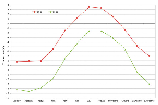 Mean values of the maximum (Tx-m) and minimum (Tn-m) temperatures for the 1961–1990 period [17].