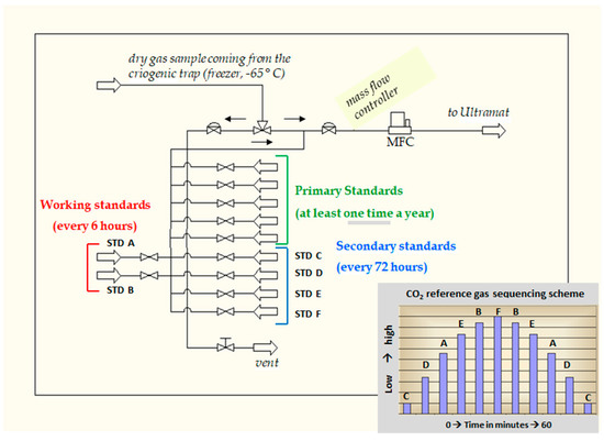The analyser system is calibrated regularly. The calibration procedure consists of three different steps: the first one regards the measurement of the air by means of two working gas standards (every six hours); the second one involves checking the secondary standards (every 72 h); the third one makes use of five referenced NOAA (National Oceanic and Atmospheric Administration) primary gas standards (referenced scale WMO X2007 [18]), and this is performed at least once a year. This type of approach is based on the work of Komhyr et al. (1989) [19] and Cundari et al. (1995) [20]. The two working gas standards are compared every 72 h with four well-calibrated secondary station standard gases in order to obtain a better determination of their CO2 concentrations and any possible drifts in the concentration with time (measurement scheme shown in Figure 4). The working and secondary standards were acquired from S.I.A.D. (Società Italiana Acetilene e Derivati) and the primary standards were purchased from NOAA ESRL/GMD (National Oceanic and Atmospheric Administration—Earth System Research Laboratory/Global Monitoring Division). The working and secondary standards, before being utilised, are referenced to the primary standards in order to determine the values with respect to the WMO X2007 scale. Finally, the current primary standards were supplied by the ICOS (Integrated Carbon Observation System) project [6]. The NOAA primary standard concentrations range from 369.58 to 404.64 ppm and the ICOS concentrations range from 379.194 to 449.890 ppm.