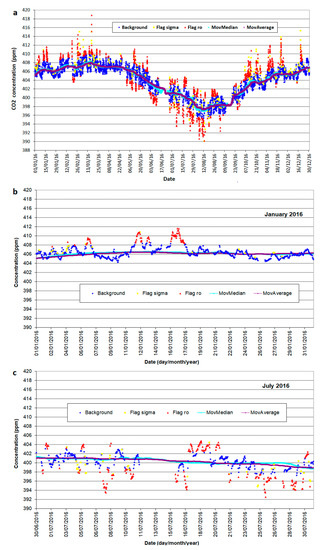 The triangles represent all the raw hourly data measured in 2016 at PRS. The yellow triangles refer to the data that did not pass step 1 and the red ones to those that did not pass step 4. The blue triangles refer to the data that were considered background data. The curves in cyan and brown represent the moving median and moving average computed for 21 days of measurements, respectively, year 2016 (a), in January 2016 (b) and in July 2016 (c).