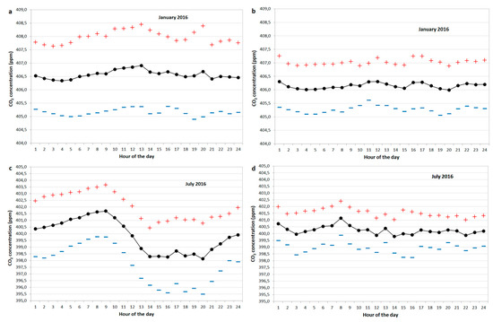 Mean CO2 diurnal cycle recorded at PRS in January 2016 using non filtered data (black points), plus the standard deviation (red plus), minus the standard deviation (blue dashes) (a); and using filtered background data (b); as (a) but related to July 2016 (c); as (b) but related to July 2016 (d).