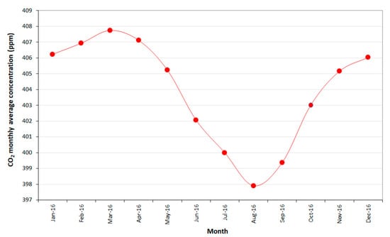 The growth of the atmospheric concentration levels of greenhouse gases in the Industrial Age is considered the major cause of the observed warming of the Earth’s surface [1]. Carbon dioxide (CO2) is the primary gas that is contributing to the enhanced greenhouse effect, and the largest contribution to total radiative forcing is caused by the increase in the atmospheric concentration of this atmospheric component [1,2]. For this reason, the CO2 concentration in the atmosphere is considered a key quantity to study and understand the global greenhouse effect and the ongoing climate change, and it is constantly monitored at several locations around the world, and in particular at remote sites [3,4,5,6]. These locations are at a great distance from significant anthropogenic sources of air pollutants, so that the CO2 background concentration measurements are poorly influenced by local sources or transport. The long-term observations of the CO2 background atmospheric concentration are of fundamental importance to investigating ongoing climate change and represent a useful tool to evaluate the success of mitigation activities against climate change.