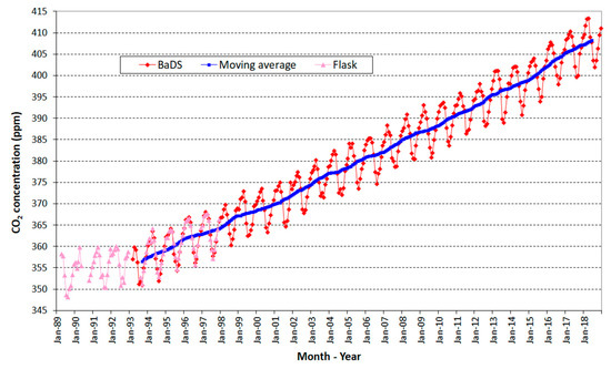 The time series of the monthly data, from April 1989 to December 2018, is shown in Figure 8. The BaDS background data started in 1993, whereas flask analysis measurements were performed in the 1989–1997 years. During the overlapped period, that is, 1993–1997, the two independent measurements were comparable (the pink and red points in Figure 8).
