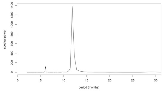 The monthly CO2 concentration spectral power was computed to identify the Ti periods (Figure 9), and the presence of two main periodic signals was observed in the temporal series, with periods of 12 months and 6 months, respectively. The annual period corresponds to the natural vegetative cycle and the semi-annual one may be related to energy consumption [58].