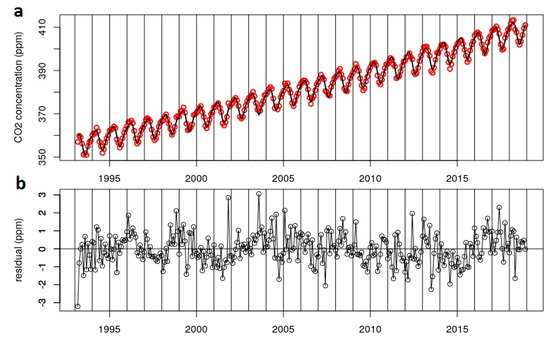 As many authors have used 4 harmonics for their fitting curve [24,60], two sinusoidal terms, with periods of 4 and 3 months, were added to Equation (5). In this test, the residual values were between −3 and 3 ppm and the RMSE parameter results were unchanged (0.86 ppm).