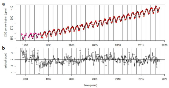 Another test was applied to the monthly CO2 means from 1989 to 2018, considering the background monthly data from 1993 to 2018 obtained using the BaDS procedure together with the monthly averages computed from flask observation without using a filtering selection (pink and red diamonds in Figure 8). An exponential fit with 4 harmonics, as in the previous test, was applied (Figure 11), and a good agreement was obtained for the whole period and also for the 1989–1993 years. In this case, the RMSE value was 1.03 ppm, as a consequence of the enhanced variability in the first years, due to more uncertainty in the data.