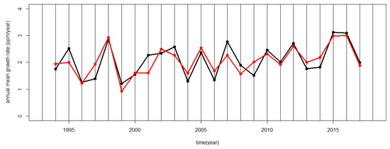 High values of the annual growth rate identify ENSO events. An inspection of Figure 12 shows that the three highest annual growth rates in the PRS data, with higher values than 2.8 ppm/year, were recorded in 1998, 2015 and 2016, when the two most intense ENSO periods occurred.