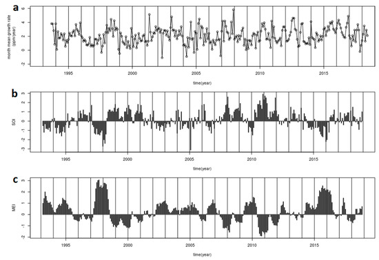 Monthly mean growth rate of the monthly CO2 background PRS series (a), SOI (b), MEI (c).