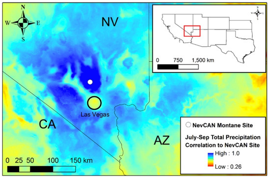 We had an opportunity to investigate monsoonal dynamics at hourly intervals thanks to an automated weather station that operated continuously since April 2011 at 2300 m asl in a remote location on the Sheep Range, ~35 km north-northwest of Las Vegas (Figure 1). This unique site is part of the Nevada Climate-ecohydrological Assessment Network (NevCAN), an observing system managed by the Nevada System of Higher Education [22]. The Sheep Range is a ‘sky-island’ within the Mojave Desert, and our site is within the Desert National Wildlife Refuge, which is managed by the US Fish and Wildlife Service. Given the relatively high elevation of our study site, vegetation is dominated by ponderosa pine (Pinus ponderosa Lawson & C. Lawson) and single-leaf pinyon pine (Pinus monophylla Torr. & Frém.), with sparse Utah juniper (Juniperus osteosperma (Torr.) Little). Shrub and herbaceous cover is almost absent. Soil type includes colluvium and/or residuum from weathered dolomite and limestone classified as loamy-skeletal, mixed, superactive, mesic Aridic Lithic Haplustolls [23].