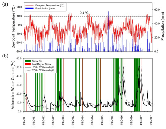A severe drought in 2012–2015 affected California as well as southern Nevada, including our study site. The number of days when snow was present for each cool season from October 2012 to March 2015 was less than for the cool seasons of October 2015 through March 2017. In concurrence, snow disappeared earlier from 2012 to 2015 (16 April 2012 to 7 March 2015) than from 2016 to 2017 (30 April 2016 to 2 April 2017) (Figure 2b). There was no significant correlation between daily precipitation and soil volumetric water content, which, however, increased substantially at both depths during the wet 2016 and 2017 water years (Figure 2b and Figure 3). Soil moisture generally remained higher at the greater depth during wet (2016–2017) and dry (2014–2015) years, whereas greater water content was observed in the shallower soil layer during most of the initial recording period (2011–2013; Figure 2b). Soil temperature varied little (data not shown) and was ≤0 °C rarely (105 days out of the 2375 included in the study period) even at the shallow (5 cm) depth we considered. All the days with average soil temperature below freezing point occurred in the cool season, with 95% of them recorded from December to February. December had an average of seven days (range from 0 to 12 days), January had average of six days (range from 0 to 21), and February had an average of three days (range from 0 to 6). No days with frozen soil were observed in February during 2015–2017, and 2017 was completely frost-free, most likely because of increased snow cover during those years (Figure 2b).