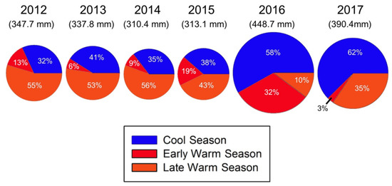 Precipitation percentages at our study site for cool (1 October–31 March), early warm (1 April to the day prior to 9.4 °C dewpoint threshold), and late warm (day of 9.4 °C dewpoint threshold to 30 September) seasons of the 2012–2017 water years.