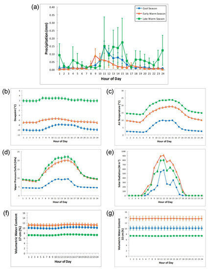 Dewpoint temperature differed by about 8 °C between early warm season (mean of −6.3 °C) and late warm season (mean of 2.3 °C) for every hour of the diel cycle (Figure 4b). This was the greatest difference between seasons for any of the variables we analyzed, and was also statistically significant for every hour (Figure 4b). Both dewpoint and air temperature increased significantly from cool season to early warm season to late warm season (Figure 4b,c). Early and late warm-season hourly VPD values were comparable during the night but were significantly greater in the late warm season during the morning and early afternoon (08:00–15:00). Early and late warm-season VPD were both significantly greater than cool season values (Figure 4d). Solar radiation was significantly lower during the cool season; it reached a maximum in the early warm season, and then significantly decreased in the late warm season likely due to increased cloud cover during the day (Figure 4e). Volumetric water content at both depths was quite stable during the diel cycle, and was highest in the early warm season, especially in deep soil, and lowest in the late warm season (Figure 4f,g), likely because of the seasonal balance between snowmelt infiltration and evapotranspiration.