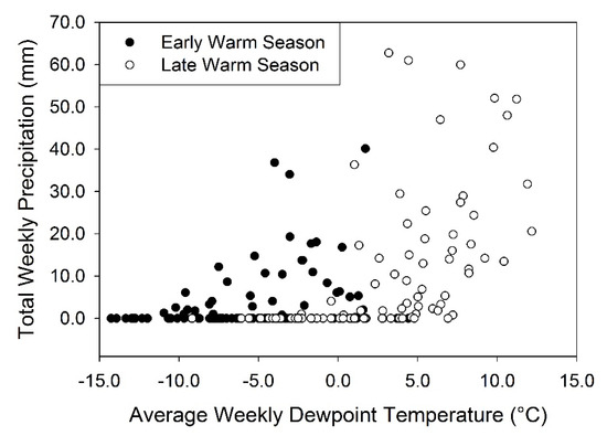 Total weekly precipitation plotted against average weekly dewpoint temperature for early and late warm season at our study site. The larger precipitation events occurred during the late warm season as dewpoint temperature increased.