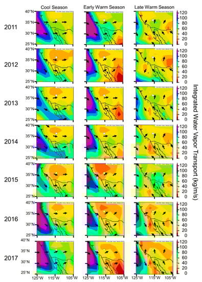 Seasonal averages of integrated water vapor transport (IVT) for the 2011–2017 water years. Pseudo-color shading with overlaid vectors (arrows) was used to indicate the amount of moisture and the direction of transport. Cool-season IVT, and resulting precipitation (Figure 3), was large in 2011, 2016, and 2017, as well as for the 2015 late warm season.