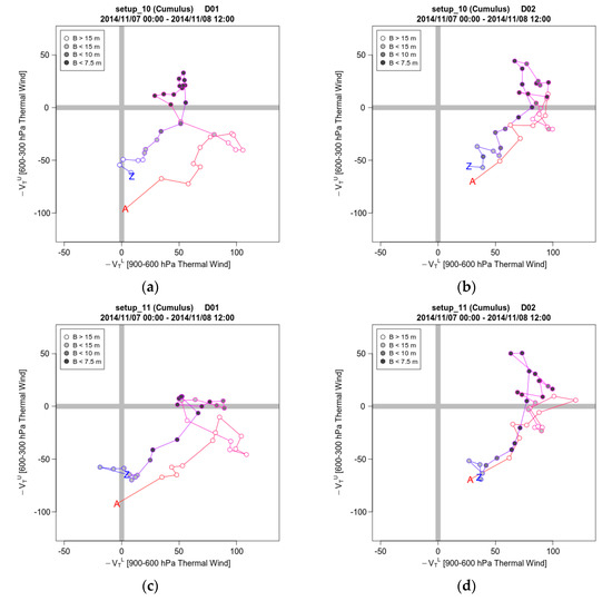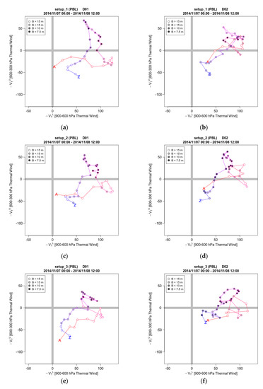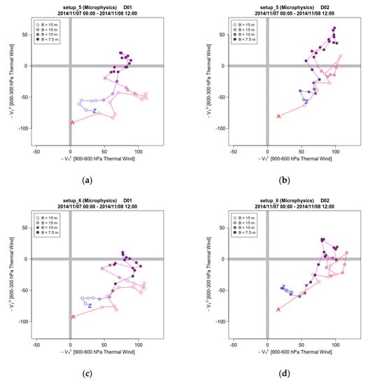 The phase space diagrams for the CU/RAD group are presented in Figure 13. Setup-13 is again an outlier and is discussed in the following paragraph. The other CU simulations also produce a symmetric warm-core that is sustained for 11-12 h. In the case of setup-10 this core clearly represents a TLC. In setups 11 and 12 it is disputable whether the core becomes deep for long enough signifying the emergence of a TLC. In setup-12 the values of VTU are marginally positive for about 10 h while in setup-11 the value of VTU is at the same time slightly smaller and it fluctuates around zero. If the criteria of Hart [13] are to be considered accurate, then a TLC was formed in setup-12, although not particularly strong, and not in setup-11. However, we consider that in both cases it is debatable whether a TLC was formed or not. The times and duration in Table 3 refer to the case that a TLC was formed. In the D02 domain in all CU simulations, including setups 11 and 12, a deep symmetric warm-core is clearly formed and lasts for 12-14 h.