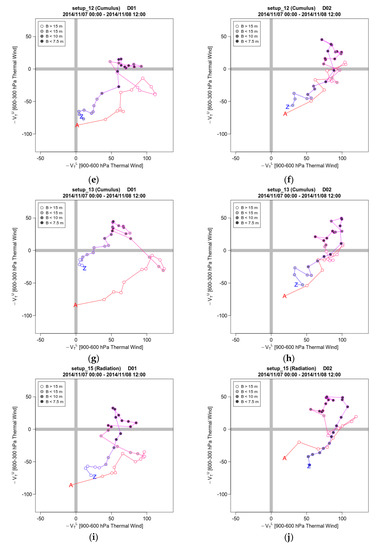 Phase space diagrams of −VTL (900–600 hPa) against −VTU (600–300 hPa) as predicted from model PBL/LSM experiments in D01 for: (a) setup_1, (c) setup_2, (e) setup_3, (g) setup_4, (i) setup_14 and in D02 for: (b) setup_1, (d) setup_2, (f) setup_3, (h) setup_4, (j) setup_14. Symmetry B is denoted by the shade of circles.