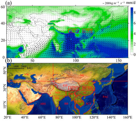 (a) Annual mean precipitation (shades) and column integrated moisture flux from surface to 50 hPa (arrows) in the wet season (April–September) in the study region, over 1982–2011. (b) Sixteen sub-regions of the evaporative source of precipitation in the two target regions. The Southeast Tibetan Plateau (SETP) and the Middle Yangtze River Basin (MYRB) are the two target regions, indicated with red rectangles. In addition to the two target regions, 14 sub-regions in Figure 1b include the rest of the Tibetan Plateau except for the SETP (RTP), the Bay of Bengal (BB), Northern India (NIN), Southern India (SIN), Central China (CC), Bangladesh and Myanmar (BM), the Arabian Sea (ARS), Southern China (SC), the South China Sea (SCS), Indochina (INDO), the Pacific Ocean (PAC), the western area (WE), the northwestern area (NW) and the northeastern area (NE).