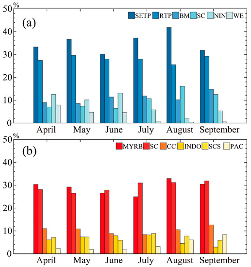 Monthly variations of the top six evaporative sources of precipitation in the (a) SETP and the (b) MYRB in the wet season, averaged over 1982–2011. The monthly evaporative source percentage for each sub-region is the contribution of the evaporative source in the sub-region to the precipitation in the target region.