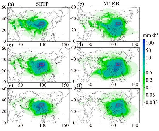 Monthly variations of evaporative sources (unit: mm d−1) for the SETP (left) and the MYRB (right) in the wet season (a,b) April–May, (c,d) June–July, (e,f) August–September over 1982–2011. Red boxes represent the target regions.