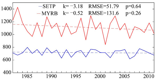 Variations and linear trends of annual mean precipitation (unit: mm) over 1982–2011 in the SETP and the MYRB, based on the station observations of the Chinese Meteorology Administration. K represents the slope of the linear regression lines (unit: mm d−1 a−1), RMSE represents the root mean square error of the linear regression (unit: mm). The p value is also represented.
