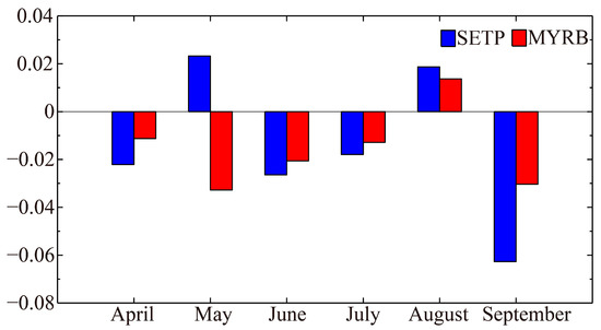 Seasonally, the precipitation decreases in the wet season, except for in August and May in the SETP (Figure 5). The largest decreases in precipitation are observed in September, which is mainly because of the decreases in the terrestrial evaporative source, especially in the SETP (Table 4). In the SETP, the sub-region with the dominant decreased evaporative source in September is the RTP, followed by the NIN, BM, and BB (Table 3). In the MYRB, the South China Sea (SCS) and Southern China (SC) to the south are the sub-regions that experience decreased precipitation in September, which is different from the SETP (Table 3). Given the dominance of the terrestrial evaporative source (Table 4), decreases in the evaporative source in the RTP, NIN, and BM are more responsible for the decreases in precipitation in the SETP. For the MYRB, evaporation decreases in Southern China (SC) are the most crucial, except for the INDO and BM.