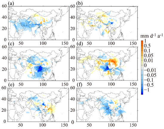 Linear trends of monthly common evaporative sources (unit: mm d−1 a−1) for the SETP and MYRB in the wet season (a) April, (b) May, (c) June, (d) July, (e) August, (f) September over 1982–2011. Common areas are defined as areas with the same positive or negative trends in terms of evaporative source for both target regions.