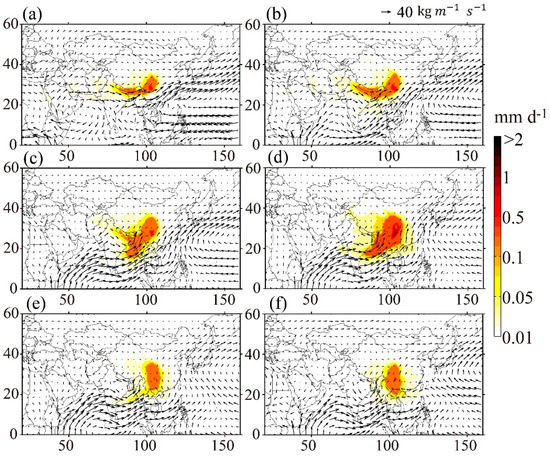 Monthly mean common evaporative sources change larger than 0.01mm d−1 (shades) for both target regions, and monthly integrated moisture fluxes (unit: kg m−1 s−1) from surface to 50 hPa (arrows) in the wet season (a) April, (b) May, (c) June, (d) July, (e) August, (f) September over 1982–2011.