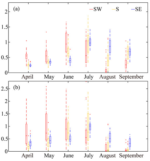 Box-whispers of the normalized evaporative sources for three groups of featured sub-regions (southwest area (SW), south area (S) and southeast area (SE)) from April to September over 1982–2011 for (a) the SETP and (b) the MYRB.