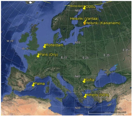 A number of European cities were selected for the study, as presented in the map of Figure 1. The cities represent different geographical areas of Europe, for instance southern, central, and northern Europe, and experience different background climatic conditions. Table 1 includes the cities along with coordinates and altitudes of the meteorological stations used for each city, as well as available study periods spanning several decades until the present. The climate type of each city, following the updated Köppen–Geiger climate classification [41,42], is also shown in Table 1. Largely varying climates between the selected cities are of interest, enabling the assessment of both heat- and cold-related risk and their long-term trends. It is also important to explore if and to what degree cold cities like Helsinki and Oulou encounter thermal discomfort conditions not previously experienced, or how heat-related stress evolves in warm cities like Athens. Large cities like Paris are also of interest due to the strong impact on population [8].