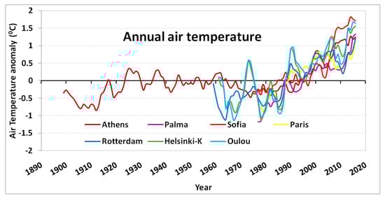 Figure 2 depicts the long-term variation of the annual mean air temperature (anomalies of the annual values from the 1974–2003 mean) at representative cities over the available study period for each city. All curves exhibit a fluctuating pattern with alterations between warmer and colder periods over the years. This is particularly evident in the centennial time series of Athens, where for instance, warmer conditions in the 1950s are followed by a cooler period until the mid-1970s, when an ongoing warming is observed until the present. Despite the fluctuating patterns, a statistically significant (p < 0.05) long-term upward trend was observed in all cities denoting the warming tendency over the study periods. All stations experience an ongoing warming from the mid-1970s onwards, amounting roughly to 0.4 °C/decade at Paris and Rotterdam; 0.5 °C/decade in Athens, Palma, and Sofia; and 0.6 °C/decade at Helsinki.