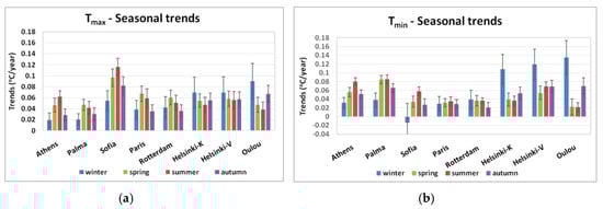 Seasonal analysis of the daily maximum (Tmax) and daily minimum (Tmin) temperatures disclosed markedly different warming rates depending on the season, index, and city. Figure 3a,b shows the trends (slopes and confidence intervals derived from linear regression analysis, in °C/year) of Tmax and Tmin at all sites over the common period 1976–2018. Due to large gaps in daily records of Tmin at the Sofia station, the seasonal trends were derived from monthly values of Tmin calculated from the broadly used formula Tavg = (Tmax + Tmin)/2 [54]. All trends are positive (except for the winter trend of Tmin at Sofia, which is marginally negative) indicating the warming tendency in both daytime and nighttime air temperature in European cities over the last decades. Moreover, the vast majority of trends are statistically significant at least at 95% significance level (Table A5 and Table A6 in Appendix B). However, the warming rates exhibit significant inter-diurnal (difference between Tmax and Tmin), seasonal, and spatial variability between different European areas.
