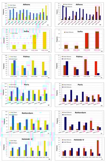 Τhe analysis also revealed an increase in the frequency of hot extremes (both hot days and HWs) and decrease in the cold extremes (cold days and CWs) frequency at all cities. Hot extremes in most cities have almost tripled during the last two or three decades compared to the past ones. It is noteworthy that northern cities in Finland have experienced an unprecedented increase in the HWs frequency only during the last decade in contrast to the other cities presenting an earlier beginning of increased hot extremes around the 1990s (Paris, Rotterdam, Sofia, Athens). However, the decline in CWs frequency is gradual during the last four decades at the same cities. Sofia exhibits an overwhelming increase in the hot days and HWs frequency during the last two decades with a nearly four-fold increase in their frequency compared to the past decades. Despite the general pattern of increasing (decreasing) trend in hot (cold) extremes in all cities, not all of the trends are statistically significant (Table A7), given the fact that HWs/CWs are, in general, rare events and the time series do not span many decades in some stations (Table A7).