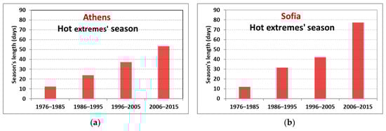 Average length of the hot extreme’s season in Athens (a) and Sofia (b) for the past four decades.
