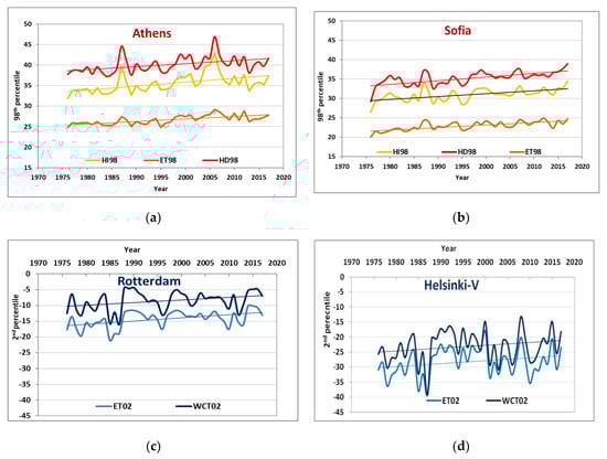 Temporal variation of the upper 98th of heat index (HI), humidex (HD), and effective temperature (ET) at Athens and Sofia (a,b) and of the lower 2nd percentile of ET and new wind chill equivalent temperature (WCT) at Helsinki-V and Rotterdam (c,d).
