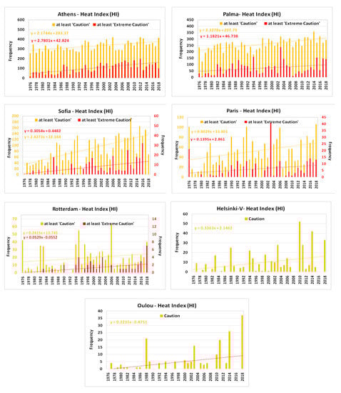 Based on HI classification (Figure 7), all cities were found to experience statistically significant (p < 0.05) upward trends in the frequency of at least ‘caution’ and at least ‘extreme caution’ conditions over the years, except Rotterdam in at least ‘caution’ and Paris in at least ‘extreme caution’ categories, with p < 0.10. As expected, noticeably higher frequencies are observed in cities with hotter background climate in summer like Athens, Palma, and Sofia. In Athens and Palma, the frequency of at least ‘caution’ and ‘extreme caution’ conditions exhibit the largest trends, while both categories have almost tripled in Sofia during the last decade compared to the mid-1970s. In the cities of higher latitudes like Oulou and Helsinki, ‘caution’ conditions are becoming increasingly more frequent during the last decade. Such conditions are almost missing in the 1970s, while ‘extreme caution’ cases are not observed.