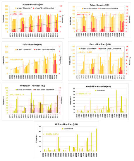 The inter-annual variability of the frequencies along with linear trends for each city and index are depicted in Figure 7 and Figure 8. In this respect, based on HI classification, at least ‘caution’ corresponds to all cases when HI > 27 °C and at least ‘extreme caution’ to all cases when HI > 32 °C. Note that although HI and HD are expressed in °C, these values do not correspond to air temperature values. As for HD classification, at least ‘discomfort’, ‘great discomfort’, and ‘danger’ conditions correspond to all cases when HD values exceed 29, 39, and 45 °C, respectively.