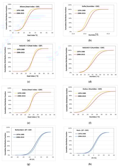 Figure 9a depicts CDF curves of the calculated HI in Athens for the two decades of 1976–1985 and 2006–2015. A shift of the CDF curve to the right is observed during the recent decade suggesting the increased probabilities of higher values throughout the range of the index. Following the HI scale, the probability of at least ‘caution’ conditions (HI > 27 °C) has increased from 43% in 1976–1985 to 58% in 2006–2015, while the corresponding ‘extreme caution’ probability (HI > 32 °C) has increased from 2.5% to 13%, respectively, indicating a fivefold increase in extreme caution conditions in Athens since the mid-1970s. Analogous increase was also found in the probability of at least ‘great discomfort’ conditions from the application of HD (not shown). Similarly, the probability of heat-related ‘discomfort’ conditions (HD > 29 °C) increased from 21.7% in 1976–1985 to 43% in 2006–2015 in Sofia (Figure 9b). Northern cities experience similar shifts in CDF curves, for instance the change in the probability of at least ‘caution’ conditions from 3.5% to 11% between the first and last decade at Helsinki-V (Figure 9c) and from 2% to 10% at Oulou (Figure 9e). Probability of at least ‘discomfort’ conditions based on HD was also found to have increased from 7.5% to 21% at Oulou and from 10% to 22% at Helsinki-V between the two periods (Figure 9d,f). Shifts in CDFs of HI and HD at Palma and Rotterdam were less prominent, while in Paris, the probability of at least ‘caution’ condition based on HI increased from 20% to 29% between the beginning and ending of the study period.