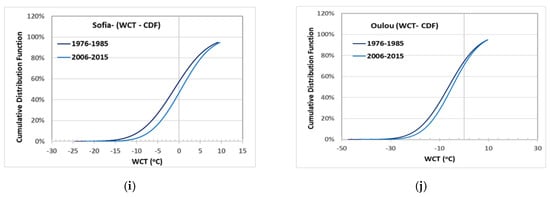 CDF curves were also produced for the indices related to cold stress, namely the effective temperature (ET) index and the new wind chill equivalent temperature (WCT) index (Figure 9g–j). Figure 9g shows the CDF curves of the ET index corresponding to the decades at the beginning and ending of the study period for Rotterdam. The CDF curve in the last decade also exhibits a shift to the right, namely to higher values of the index. Following the scales for comfort/discomfort levels of the ET index (Table A3), it is concluded that the probability of at least uncomfortably ‘cold’ conditions (ET < 9) dropped from 83% at the beginning to 75% at the ending of the study period, while the probability for at least ‘very cold’ conditions (ET < 1) decreased from 50% to 42% accordingly. The same index, when applied in Paris, showed a decrease in the ‘cold’ conditions’ probability from 75% to 66% and in the ‘very cold’ conditions from 42% to 36% between the first and last decade (Figure 9h). In Sofia, the probability of cold-related discomfort conditions based on WCT (WCT < −10) dropped from 7.5% to 3% between the first and last decades (Figure 9i), while at Oulou, cold discomfort conditions based on WCT decreased from 38% to 28%. The decrease is more prominent in the probability of cold-related risk (WCT < −28), which declined from 1.7% in 1976–1985 to 0.4% in 2006–2015 at Oulou.
